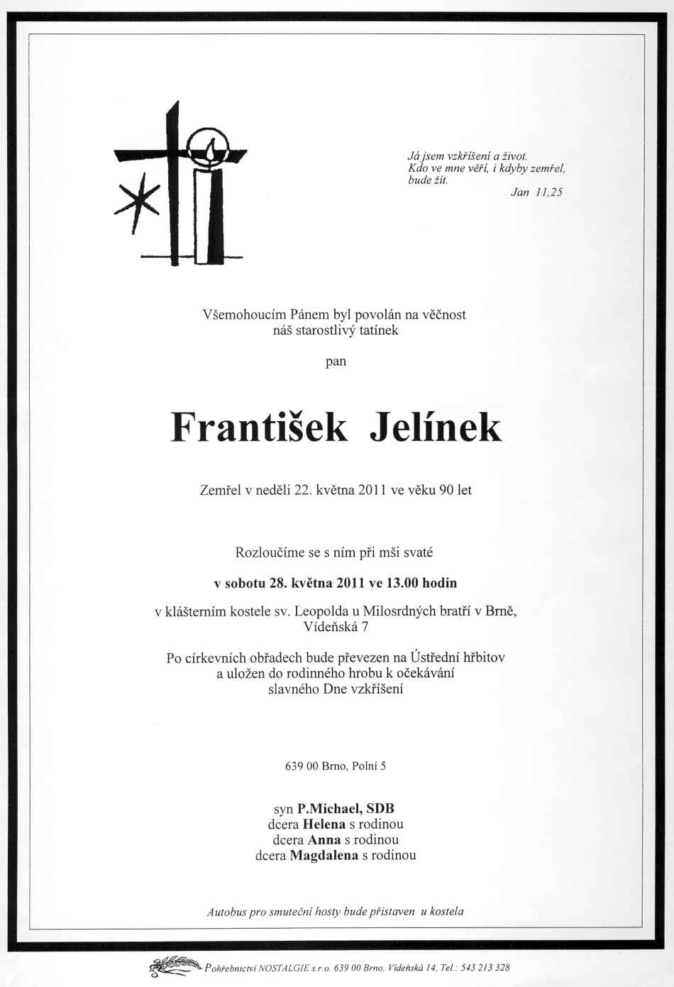 V neděli 22. 5. zemřel ve věku 90 let pan František Jelínek z Brna - tatínek P. Michaela Jelínka SDB. Pohřeb se bude konat 28. 5. ve 13 h v klášterním kostele sv. Leopolda u Milosrdných bratří v Brně.