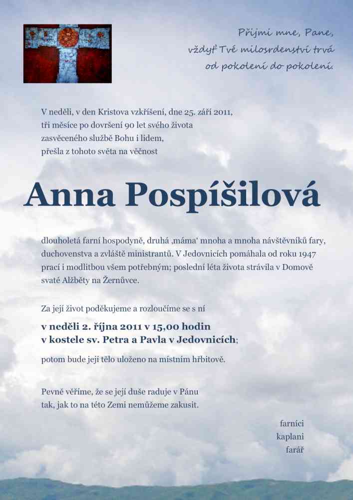 25. 9. 2011 zemřela Anna Pospíšilová, dlouholetá farní hospodyně. Za její život poděkujeme a rozloučíme se s ní v neděli