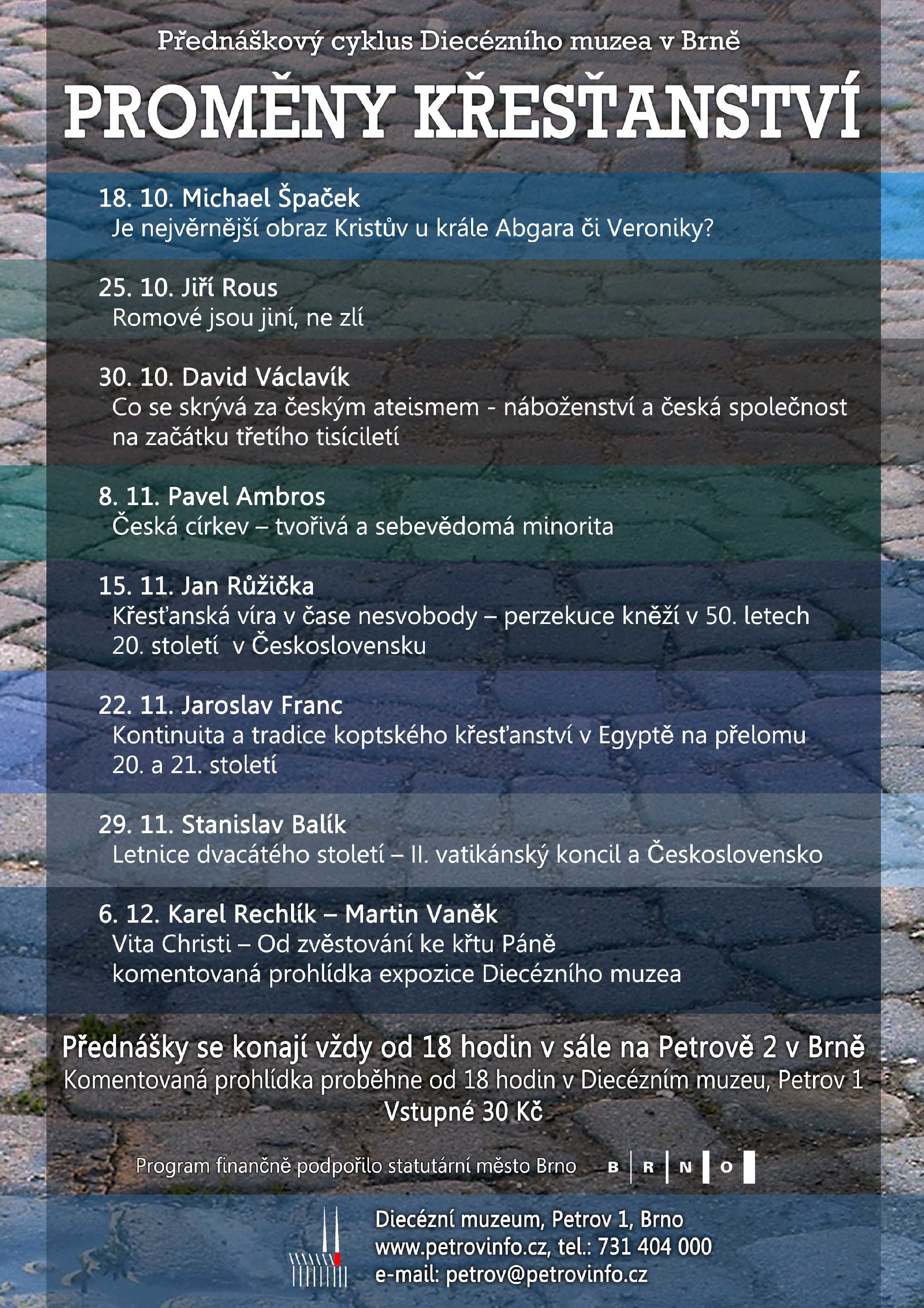 Diecézní muzeum v Brně pořádá každoročně přednáškový cyklus určený veřejnosti. Pro letošní podzim bylo vybráno několik příspěvků vztahujících se k aktuálním tématům a situacím, ve kterých se ocitá křesťanství v současném světě, případně se kterými se katolická církev potýkala v nedávné minulosti. Šest takto koncipovaných přednášek bude doplněno dvěma večery věnovanými umění.