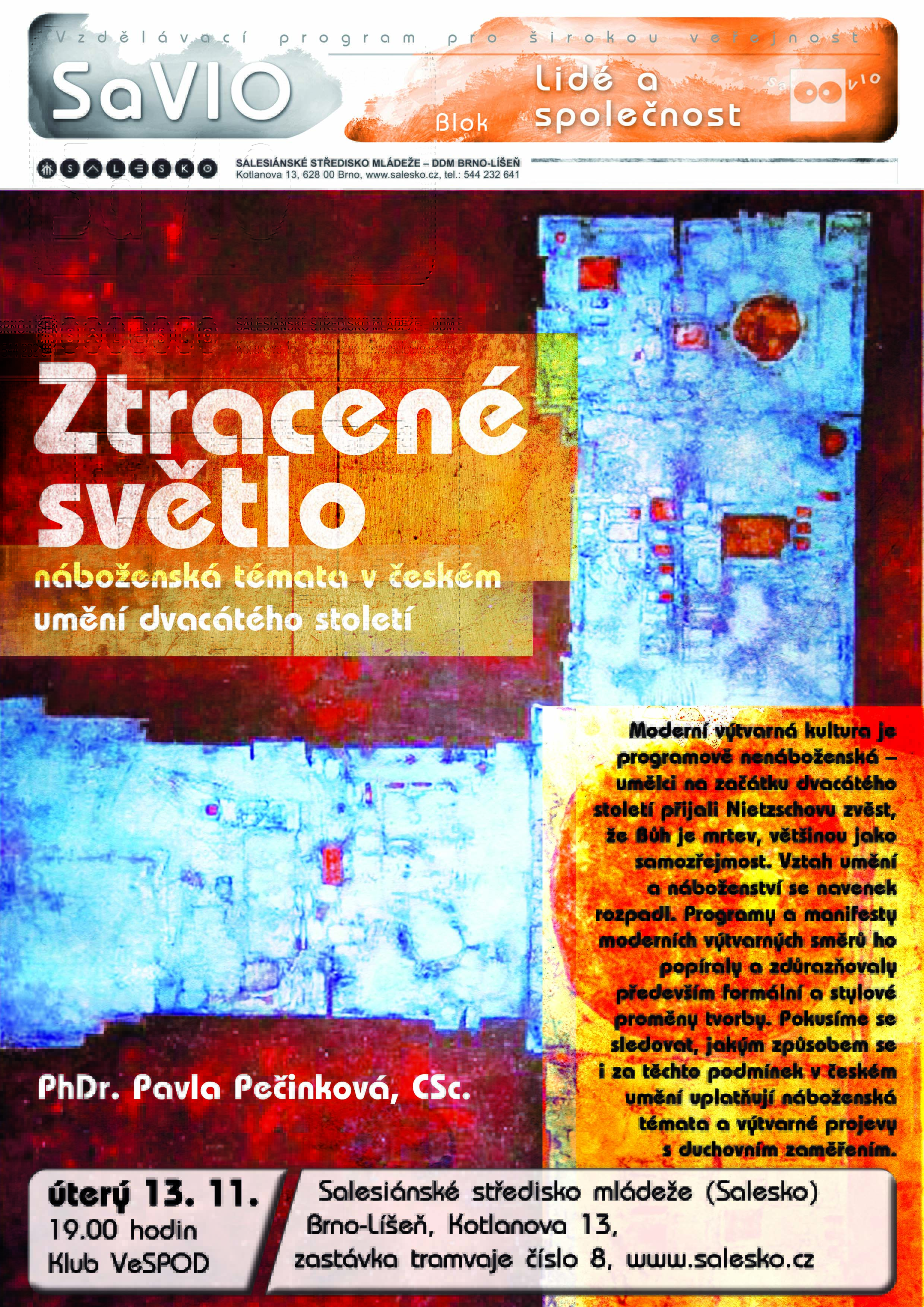 Všichni jste zváni na přednášku PhDr. Pavly Pečinkové, CSc. na téma Ztracené světlo - náboženství v českém umění 20. stoeltí, která se uskuteční
