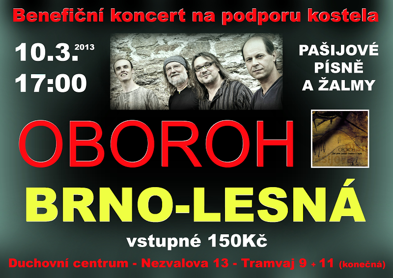 10. 3. 2013 se v 17 h uskuteční v Duchovním centru v Brně Lesné benefiční koncert skupiny OBOROH na podporu stavby nového kostela. Na programu budou pašijové písně a žalmy.
