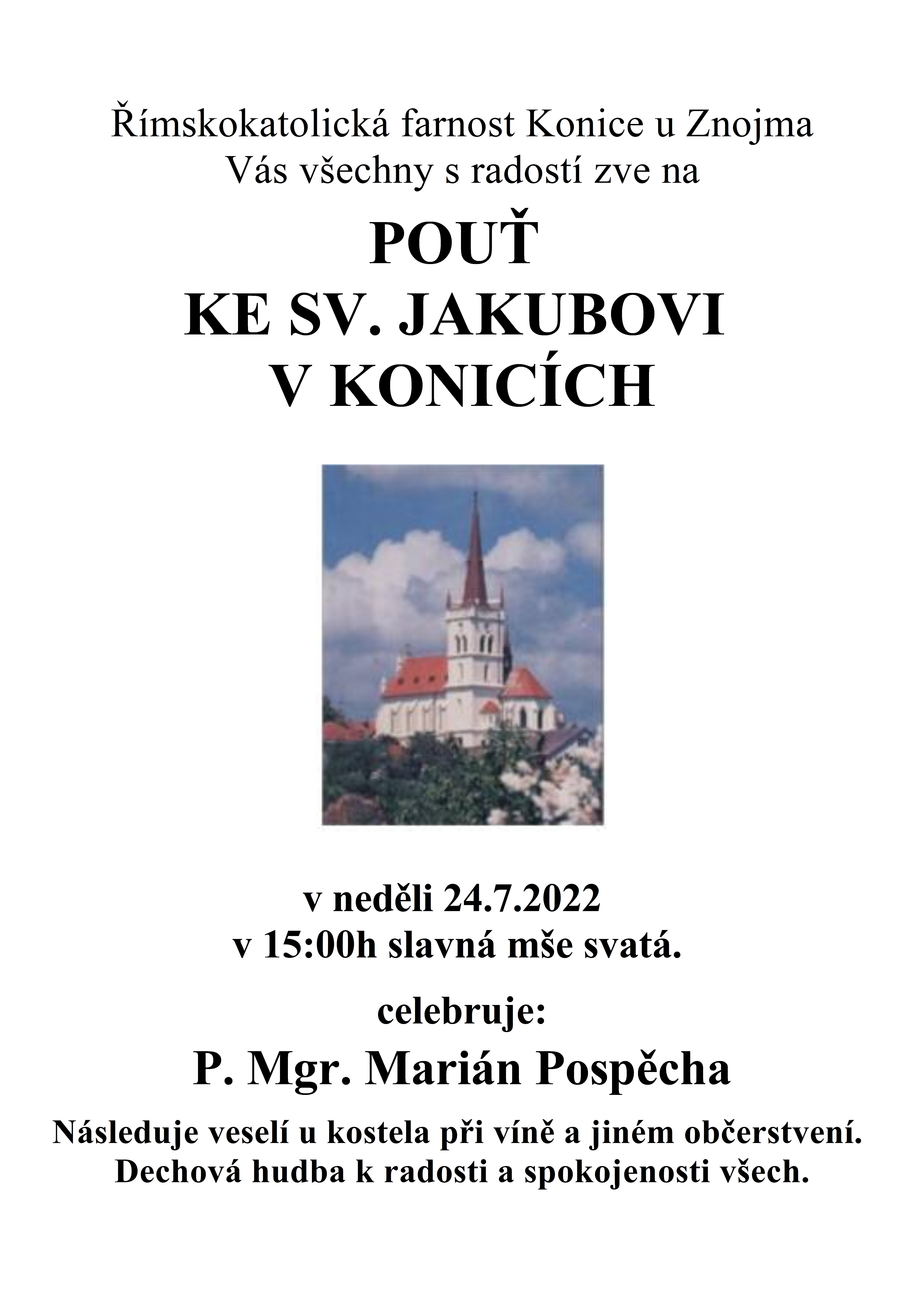 Římskokatolická farnost Konice u Znojma všechny s radostí zve na pouť ke sv. Jakubovi v Konicích u Znojma, která bude 24. 7. V 15 h bude slavná mše svatá, celebruje P. Marián Pospěcha. Plakátek ke stažení zde! Download...
