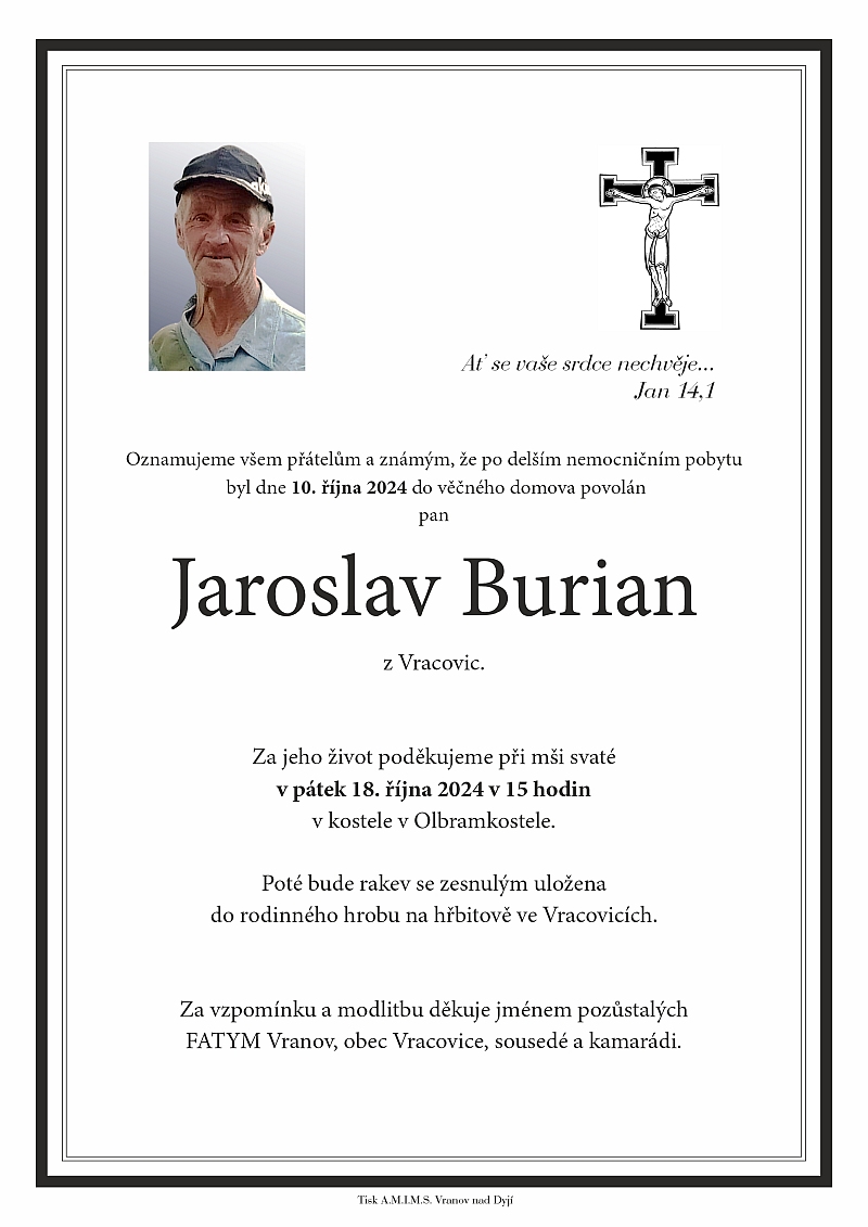 10. 10. zemřel pan Jaroslav Burian z Vracovic. Pamatujme v modlitbě.