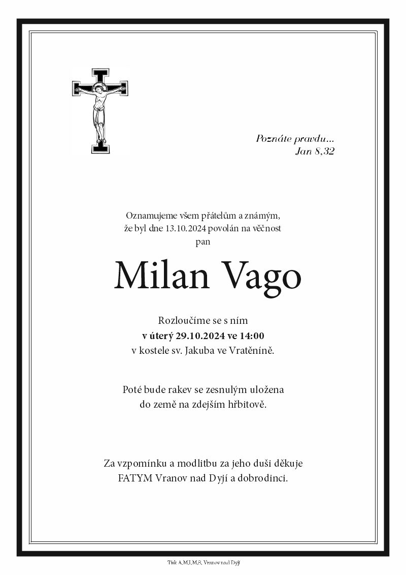 Za vzpomínku a modlitbu za jeho duši děkuje FATYM Vranov nad Dyjí a dobrodinci.