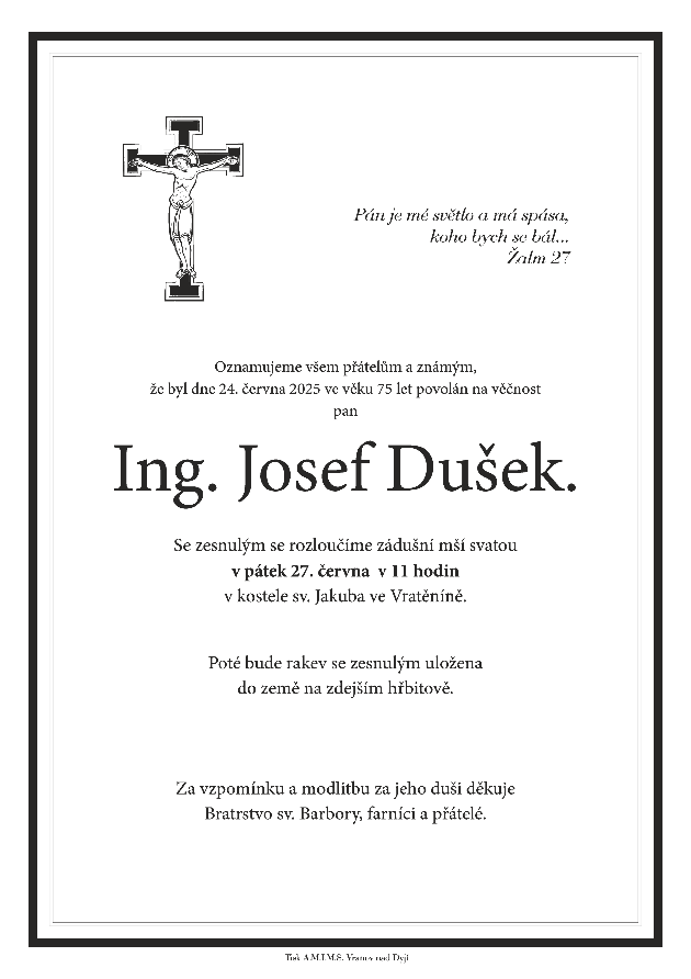 Oznamujeme všem přátelům a známým, že byl dne 24. 6. povolán na věčnost pan Josef Dušek, který v poslední době bydlel v uherčické ubytovně. Pamatujme na něj v modlitbě.