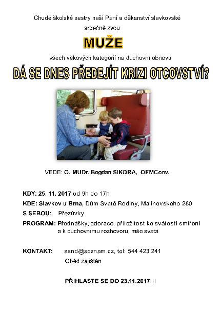 Chudé školské sestry naší Paní a děkanství slavkovské srdečně zvou muže všech věkových kategorií na duchovní obnovu, která bude 25. 11. od 9 do 17 h v Domě Svaté Rodiny ve Slavkově u Brna.