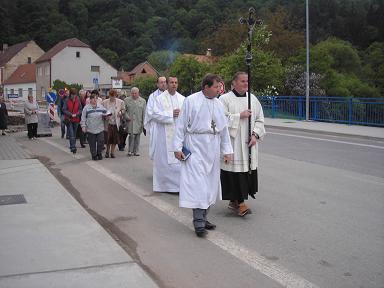 V předvečer svátku Jana Nepomuckého jsme se v průvodu vydali k soše světce. Po cestě jsme zpívali žalmy a u sochy se pomodlili litanie.