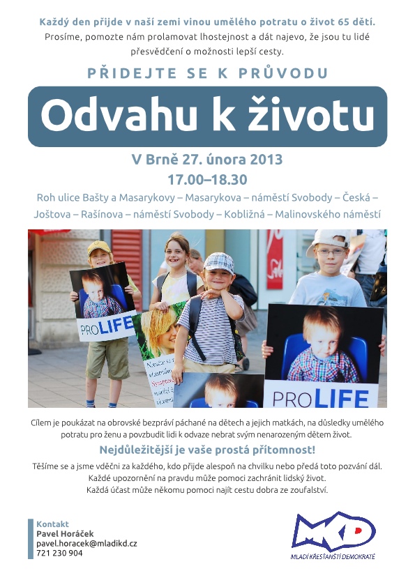 Průvod Odvahu k životu Všichni jste zváni na 9. pochod centrem Brna "Odvahu k životu", který se uskuteční 27. 2. 2013 od 17 h. Zahajuje se na obvyklém místě (roh ulic Bašty a Masarykovy naproti Hlavnímu nádraží). Plakátek ke stažení zde! Download...