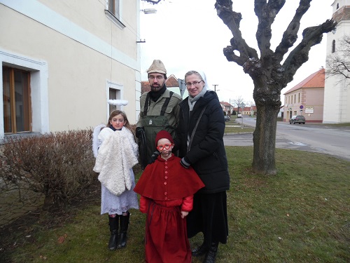 Nebeští občané se sestřičkou Josefou, která s námi konala masopust. Její přítomnost probouzela v lidech dobro a snad i upamatovávala na víru.