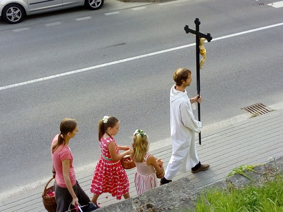 Po mši svaté, při které přistoupil Ondřej z Vranova nad Dyjí k 1. svatému Přijímání, jsme se v průvodu vydali k oltáři, který byl připraven u kapličky svatého Josefa. Cestou jsme zpívali píseň k oslavě Pána Ježíše a žalmy.