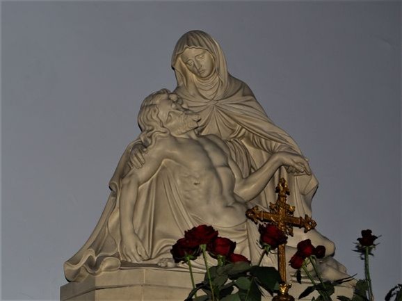 Když nastal večer, přišel bohatý člověk pocházející z Arimatie, jmenoval se Josef. I on byl Ježíšovým učedníkem. Došel k Pilátovi a žádal o Ježíšovo tělo. Pilát poručil, aby mu ho vydali. Josef vzal tělo, zavinul ho do čistého lněného plátna a uložil ho do své nové hrobky, kterou si dal vytesat ve skále. Před vchod do hrobky přivalil velký kámen a odešel. Marie Magdalská a druhá Marie (přitom) seděly naproti hrobu.