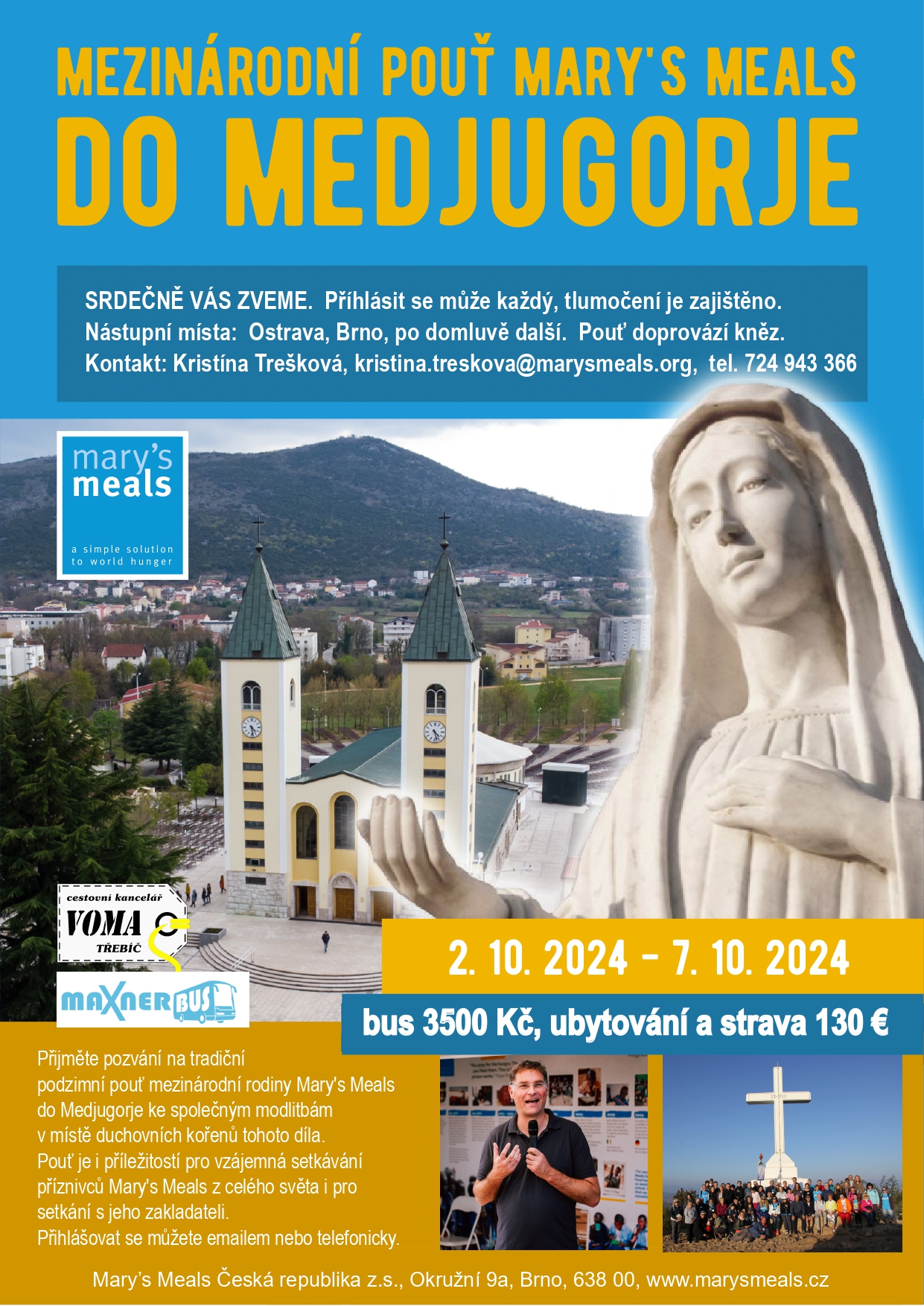 Mary's Meals Je tu pozvání na Mezinárodní pouť přátel Mary's Meals do Medjugorje, která bude od 2.- 7. 10. 2024. Můžete se těšit na setkání s Magnusem a dalšími podporovateli Mary's Meals. Plakátek ke stažení zde! Download...