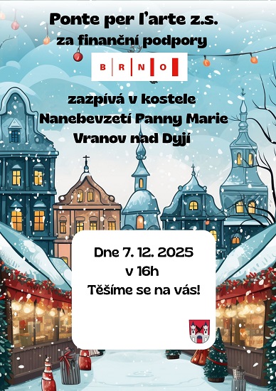 Městys Vranov nad Dyjí ve spolupráci s FATYMem Vranov vás srdečně zvou na adventní koncert skupiny Ponte per l’arte z.s. (Brno). Již tuto neděli 7. 12. v 16,00 v kostele ve Vranově nad Dyjí